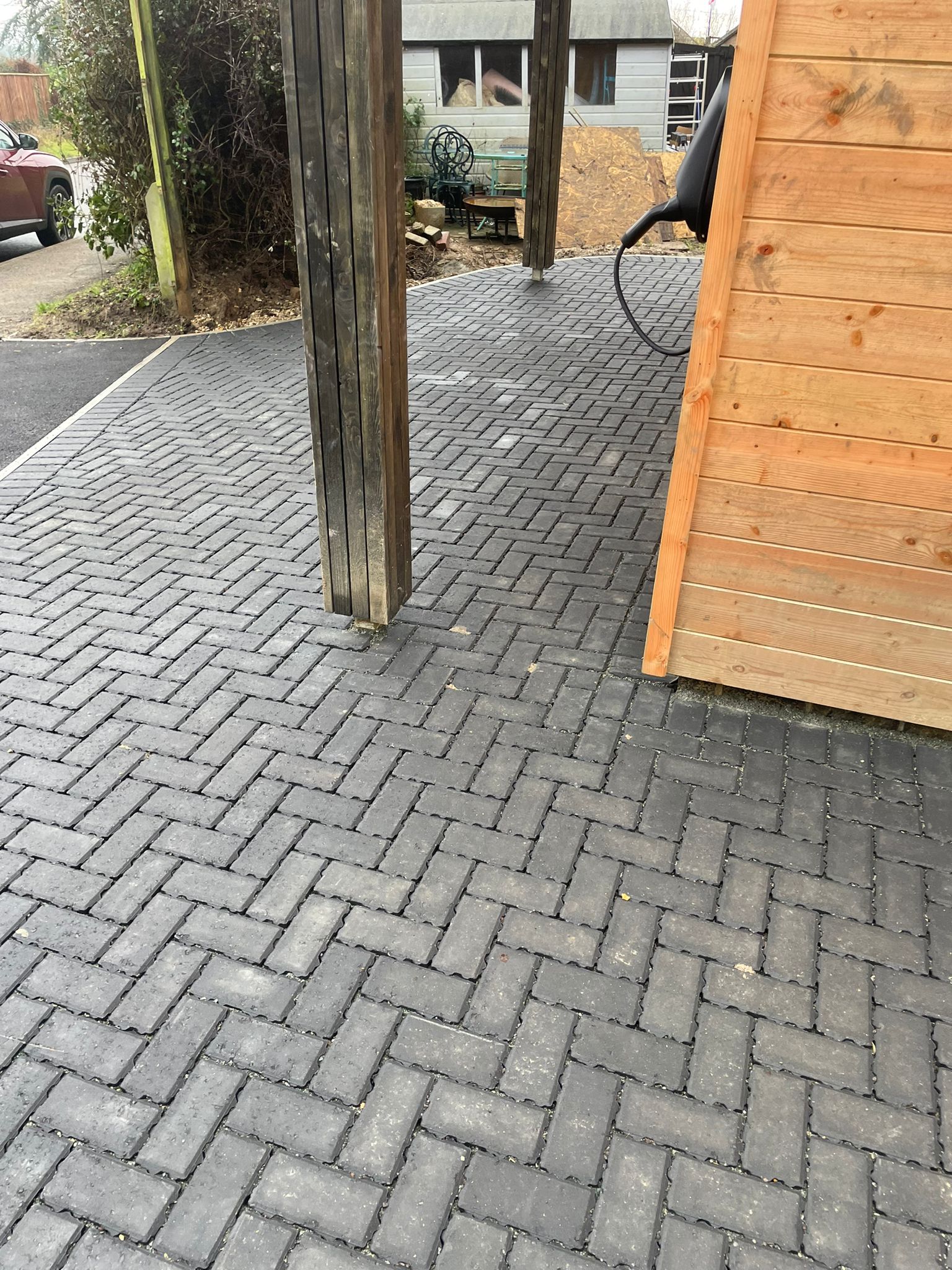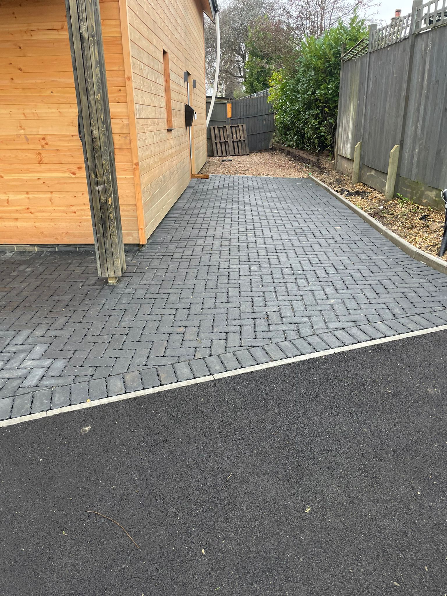 The finished driveway provides the property with a proper, functional entrance, a clean kerb transition from the road, and a block-paved surface that handles regular vehicle use without issue. The herringbone pattern and consistent charcoal colouring of the Brett Omega Flow blocks complement the contemporary timber cladding of the building.